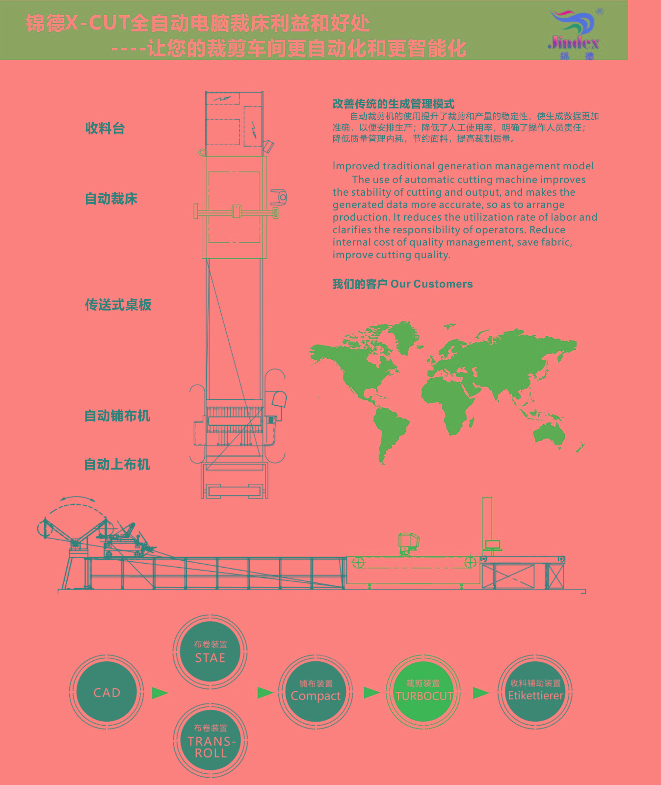 錦德智能裁剪系統(tǒng)為紡織服裝行業(yè)的打樣和小批量生產(chǎn)提供專(zhuān)業(yè)解決方案。配備...