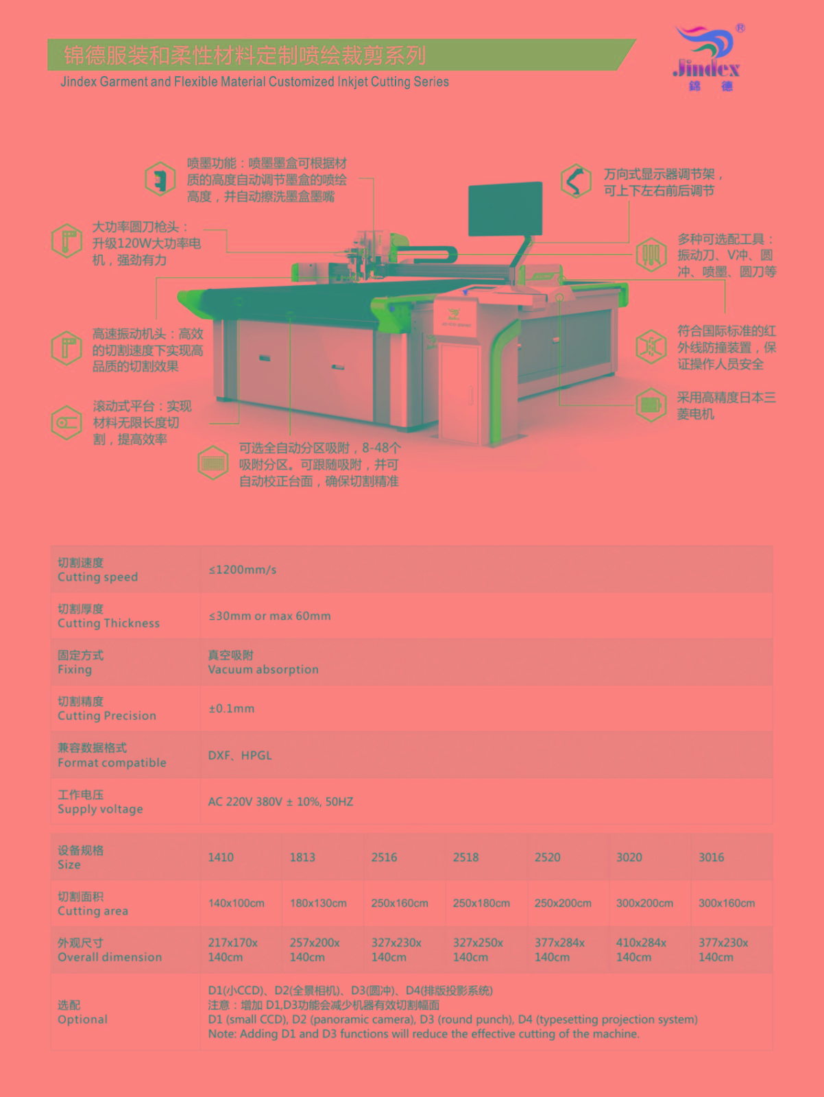 錦德智能裁剪系統(tǒng)為紡織服裝行業(yè)的打樣和小批量生產(chǎn)提供專業(yè)解決方案。配備了高速主動(dòng)輪刀、電振動(dòng)刀、氣振動(dòng)刀及第四代沖孔機(jī)頭,無論您需要裁剪的是雪紡、絲綢還是毛料、牛仔,愛科都能為男裝、女裝、童裝、皮草、女士?jī)?nèi)衣、運(yùn)動(dòng)服飾等不同類型裁剪房提供合適的裁剪工具及方案。 1.此款機(jī)型榮獲國(guó)內(nèi)外6項(xiàng)技術(shù)專利 2.全系列產(chǎn)品電氣全進(jìn)口 3.支持定做,支持對(duì)接流水線 4.自主研發(fā)系統(tǒng),普工2小時(shí)熟練上崗